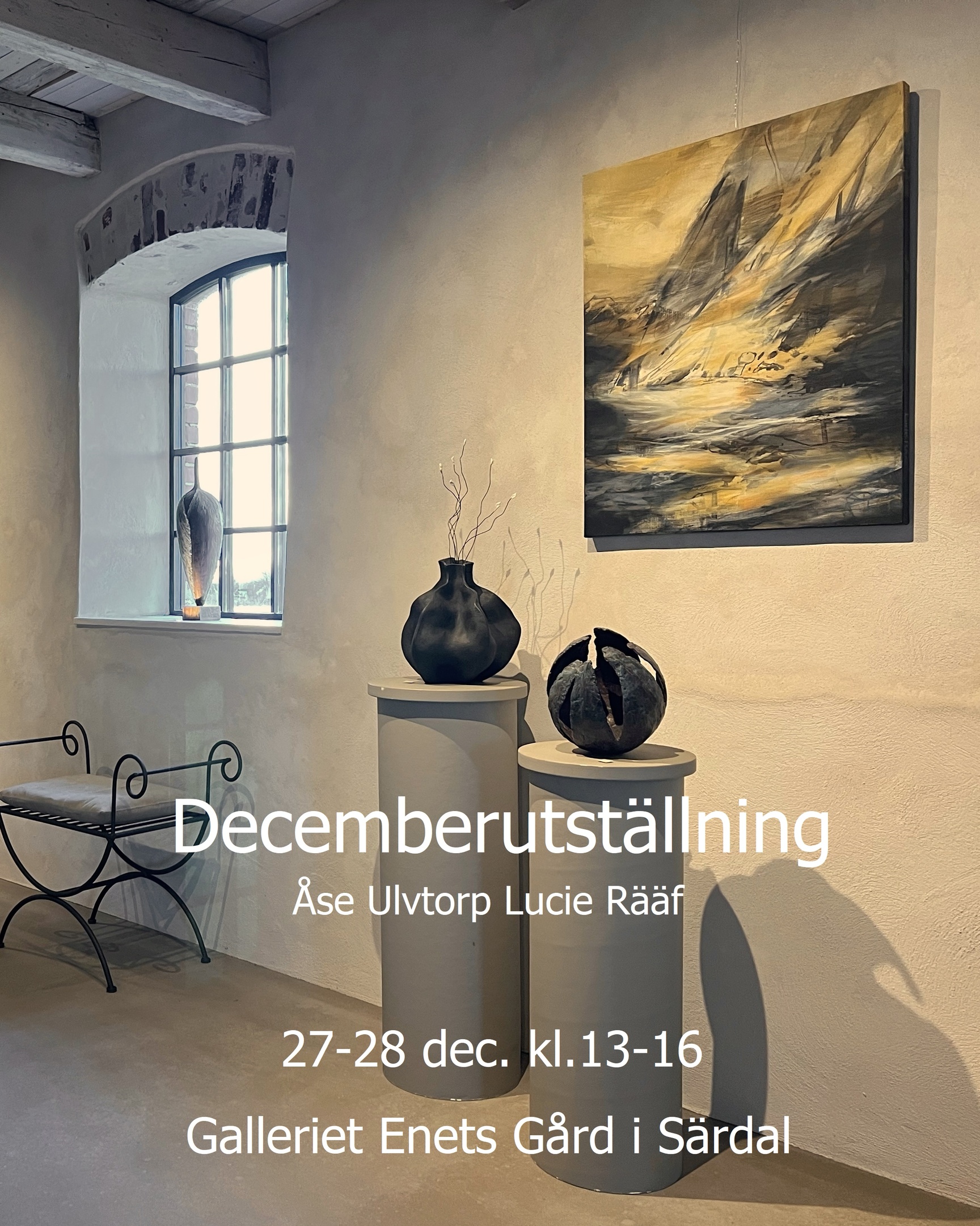 Min ateljé med tillhörande galleri är inhyst i ett gammalt stall på Enets gård i Särdal. Här finns skogen och havet nära, vilket ger mig oändliga uppslag till former, gestaltningar och uttryck.